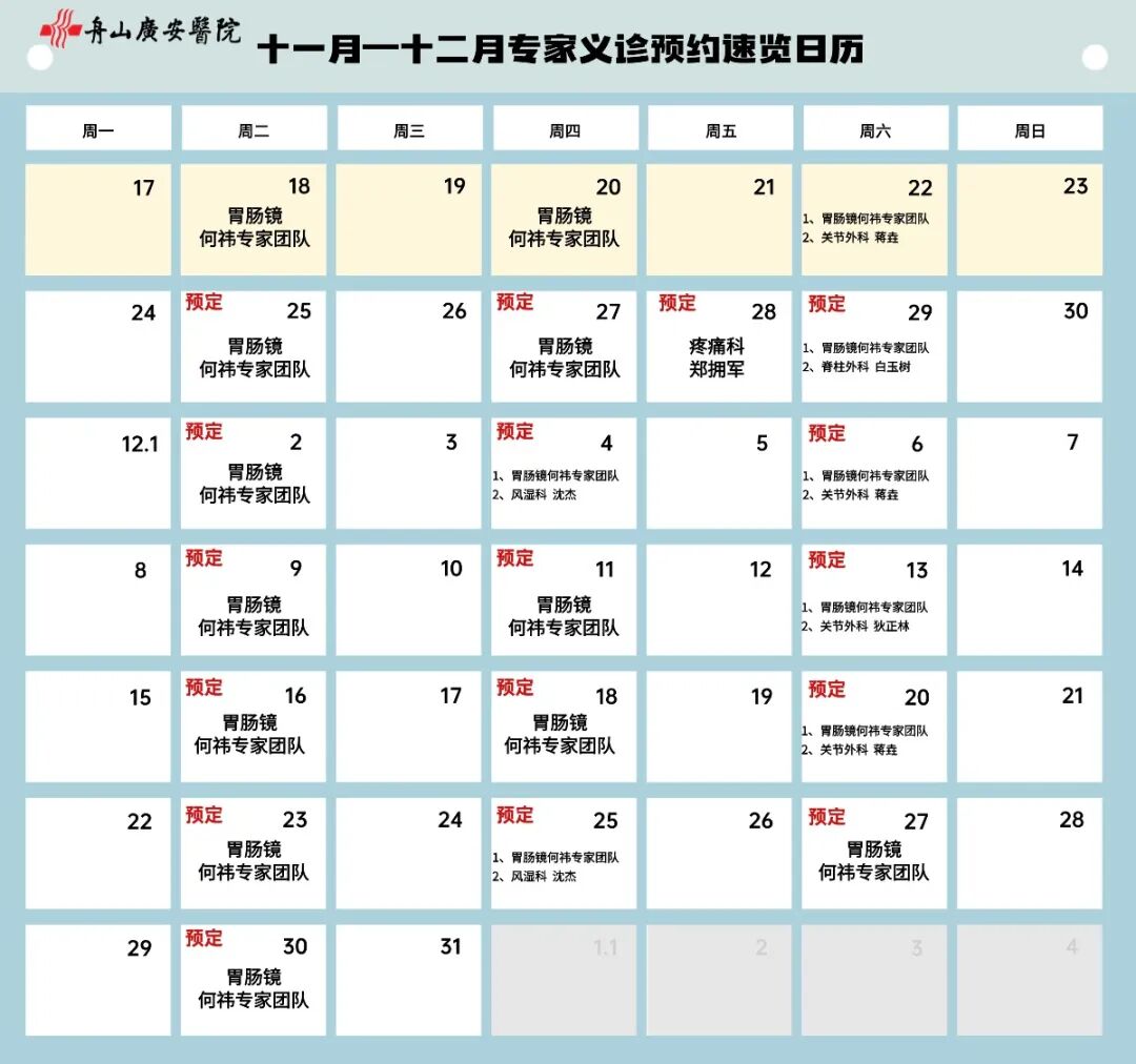 每月專家義診預(yù)約速覽日歷