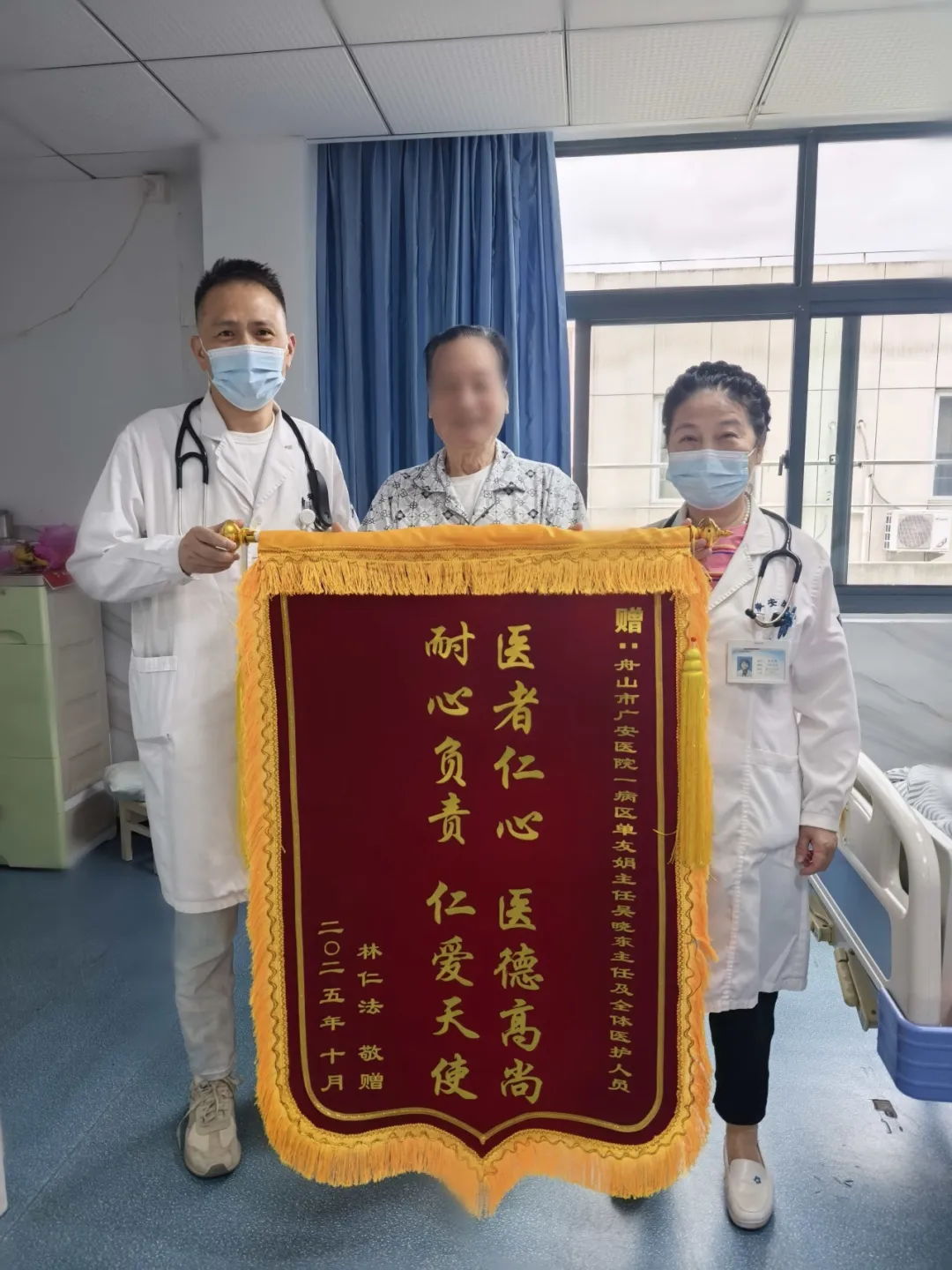 康復(fù)出院之際,激動(dòng)萬(wàn)分的患者做了一件他思量已久的事——他將一面精心準(zhǔn)備的錦旗,鄭重地送到了單主任和吳主任的手中。